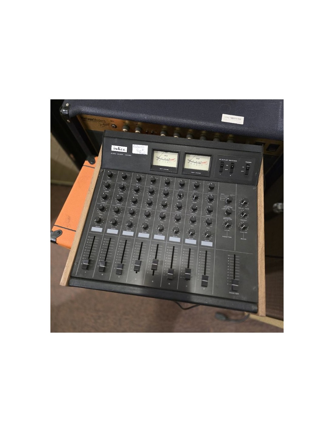 Table de mixage analogique 8 voies, typique des années 70-80, avec entrées RCA/jack et égalisation Bass/Treble sur chaque canal. La console intègre également un effet d’écho/delay et une sortie casque pour la pré-écoute. Idéale pour un setup vintage, DJing lo-fi ou home-studio rétro. Solide, simple et réputée pour son grain chaud caractéristique de l’analogique.