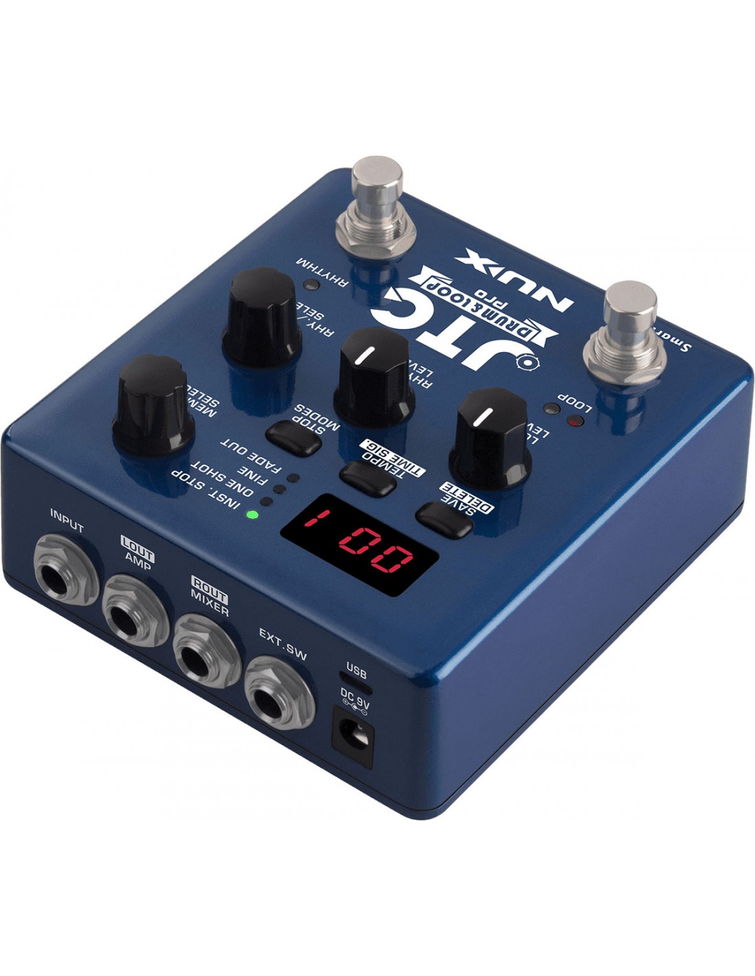 Le pilotage au pied du looper est assuré par le commutateur multifonction de gauche, selon un schéma de fonctionnement bien éprouvé : un appui pour démarrer l'enregistrement, un nouvel appui pour le couper et démarrer la lecture, et un troisième pour enregistrer des overdubs. Un appui long permet également de couper et réactiver la lecture de l'overdub. Un second schéma de fonctionnement, activant l'overdub dès le second appui, est également disponible !Une boîte à rythmes très complèteEn parallèle de ce looper très complet, la JTC intègre une boîte à rythmes non moins complète et efficace pour vous accompagner efficacement en studio ou en live. Elle met à votre disposition pas moins de 25 rythmes en 4/4, 10 en 3/4 et 5 rythmes shuffle plus axés Blues, réglables dans une plage de tempo comprise entre 40 et 240 BPM. Pour les amateurs de réglage à la volée, le BPM peut également être changé via le tap tempo sur le commutateur de gauche, avant de commencer l'enregistrement et lorsque la piste de batterie est active. Pour démarrer la boîte à rythmes, rien de plus simple : un simple appui sur le commutateur au pied de droite, et c'est parti ! Un nouvel appui lance un fill, tandis qu'un double appui désactivera la batterie.De nombreux paramètres disponibles et une connectique complètePour régler l'équilibre entre votre boucle et la boîte à rythmes, la JTC présente deux potentiomètres en façade permettant de régler le niveau de chaque partie. Elle offre également trois modes d'arrêt de lecture, allant de l'arrêt instantané au fondu tout en douceur, et deux modes de démarrage : à l'appui sur le commutateur, ou par captation d'un signal d'entrée pour faciliter le démarrage en gardant un appui long sur le commutateur. Côté sorties, la JTC n'est pas en reste avec une paire de sortie stéréo au format jack, la gauche étant dédiée au niveau amplificateur, la droite pour les tables de mixage avec une émulation d'enceinte intégrée.