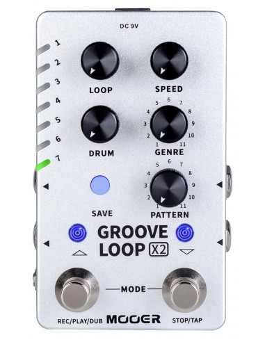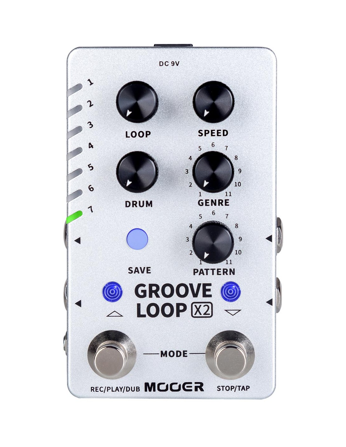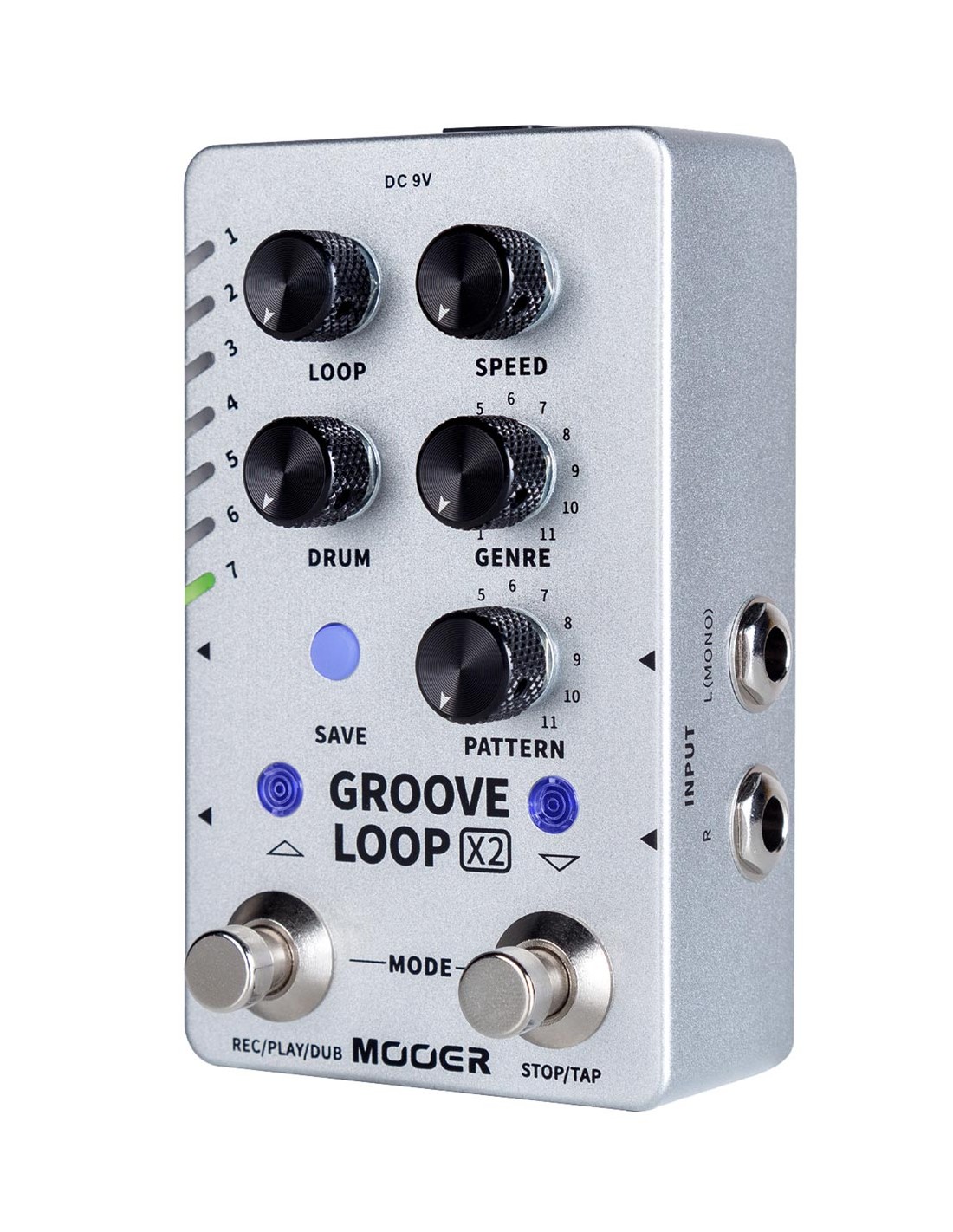 Pédale Mooer GROOVE LOOP X2, boite à rythmes et looper stéréo, 14 presets, boîtier métal, true bypass, gris.